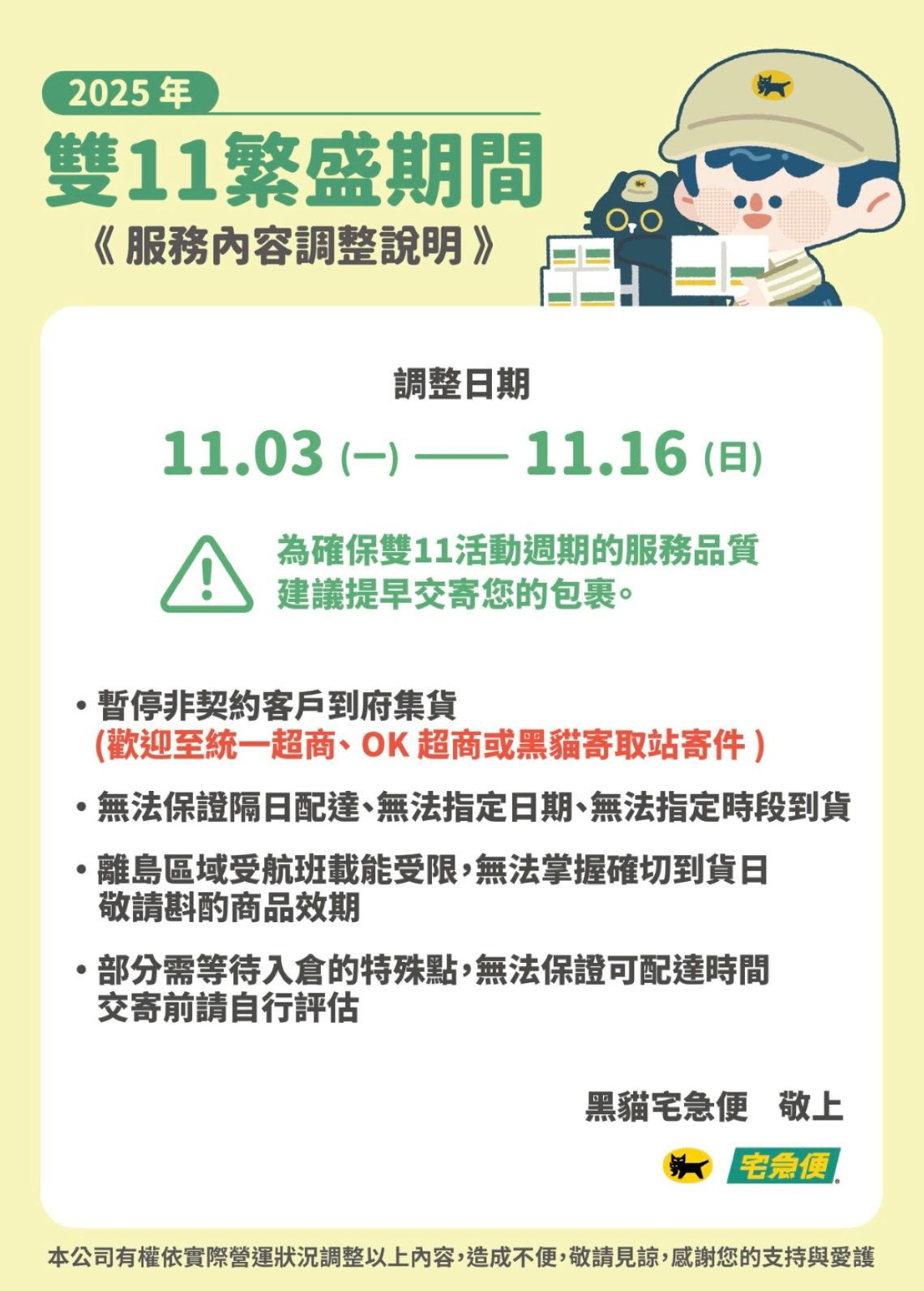 11/03~11/16是黑貓雙11繁盛期,無法保證隔日、無法指定日期、無法指定時間到貨,還請見諒。